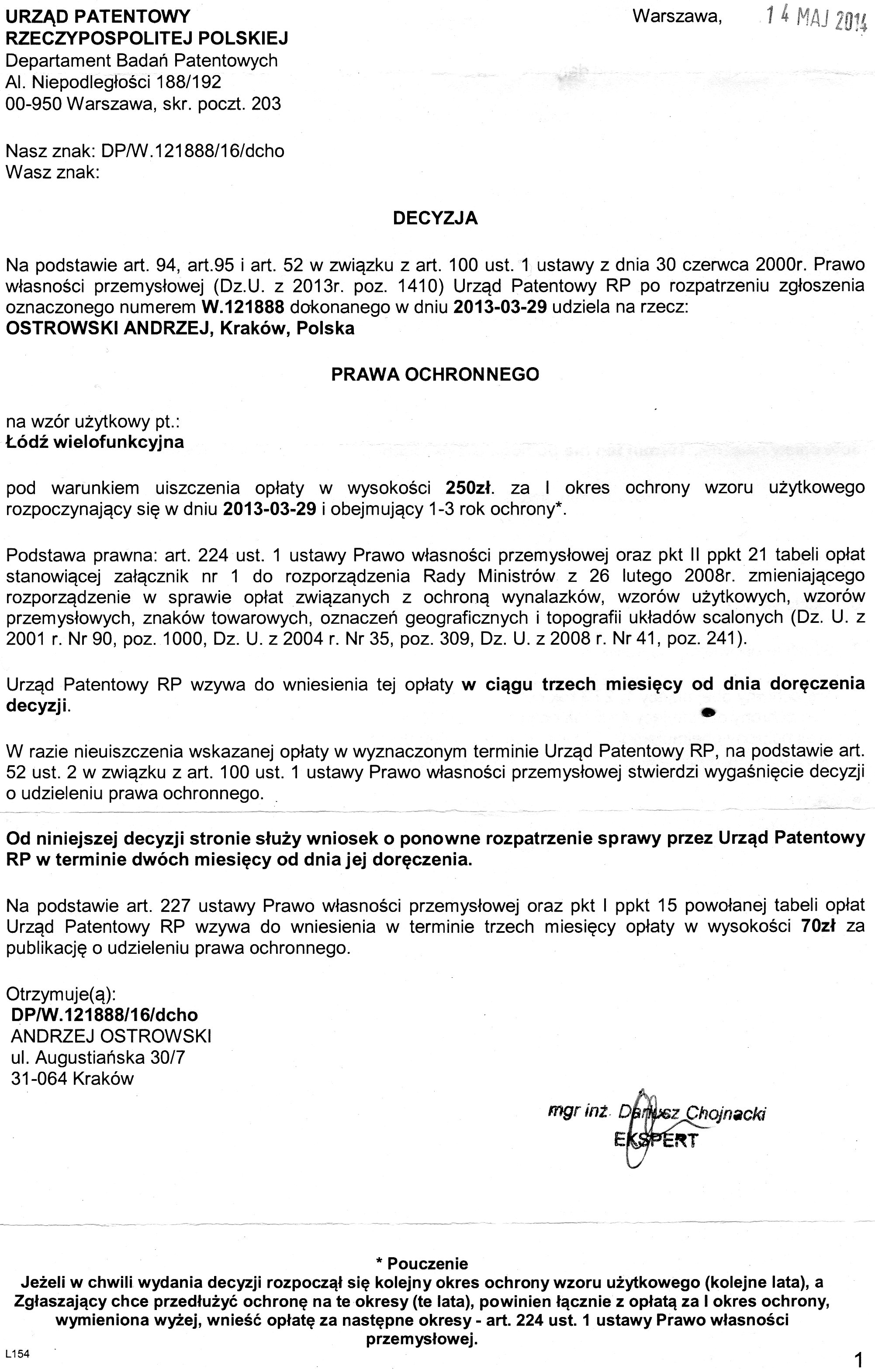 (nr 67456) na wzór użytkowy pt. "Łódź wielofuncyjna" udzielone przez Urząd Patentowy Rzeczypospolitej Polskiej,
