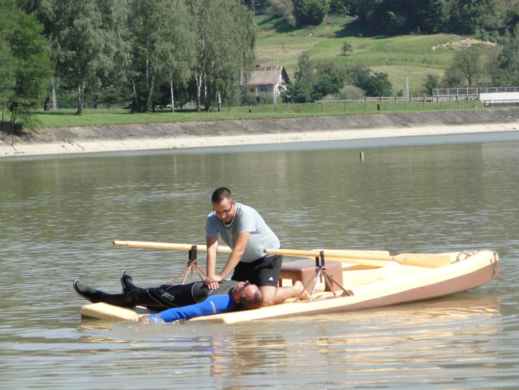 w kokpicie i udzielanie jej pierwszej pomocy przedmedycznej przez jednego lub dwóch ratowników wodnych.